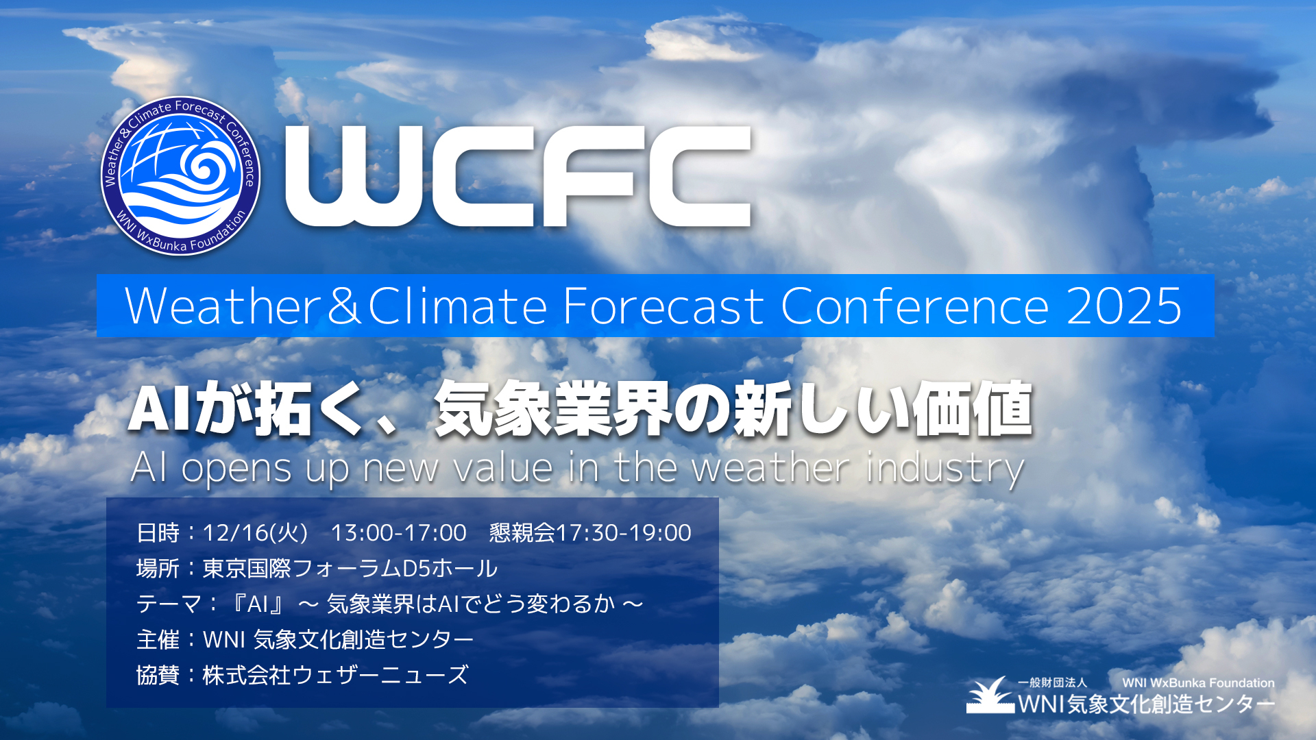 本会議は、「一般財団法人 WNI気象文化創造センター」のDreamである、アジア・太平洋地域における気象インフラ整備や予測技術の高度化支援の延長線上に位置づけられるものです。 今回は、「AIが拓く、気象業界の新しい価値」というテーマのもと、気象・気候に関する最先端の技術と知見を国際的に発信し、学術・技術・産業の連携を促進することを目的としています。また、最新の研究成果を単なる知識として紹介するにとどまらず、「気象業界の未来を創造する」ための実践と社会実装に焦点をあてた国際的フォーラムとして位置づけています。